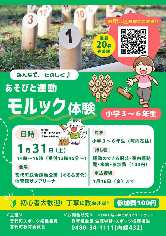 子育てひろばで、宮代町さわやかクラブ連合会のみなさんと一緒に、ミニ門松を作ります。お正月にお家の玄関に飾ろう! 講師 宮代町さわやかクラブ連合会のみなさん 定員 町内在住の中学生以下の方及び保護者 10組 申込 12月3…more