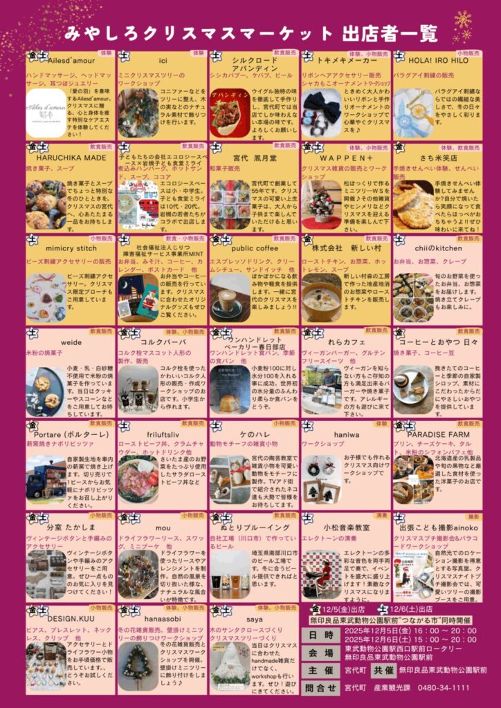 関連ページ 宮代で働こっ「〈12月5日(金) 開催案内〉みやしろクリスマスマーケット」