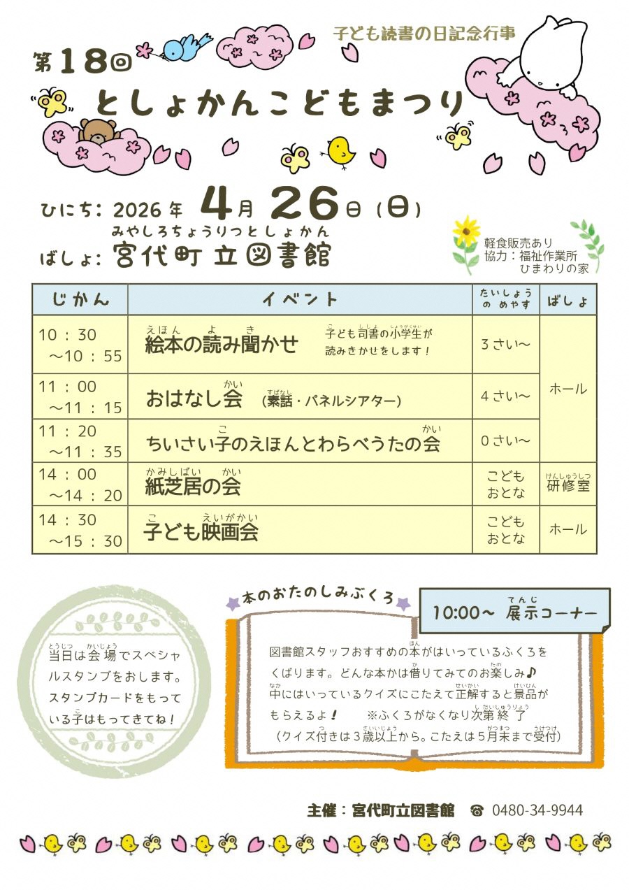 図書館で一日中、楽しめるイベントがもりだくさん!! スタンプカードを持っている子は持ってきてね♪ 当日のタイムスケジュールはちらしをご覧ください。 ・おはなし会 ・ちいさい子のえほんの会 ・絵本の読みきかせ ・紙芝居の会…more