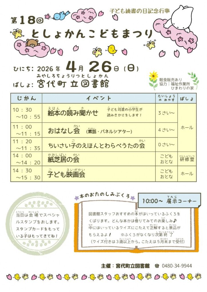 当日のタイムスケジュールはちらしをご覧ください。・おはなし会
